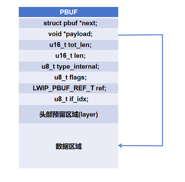 其中PBUF_ROM类型的pbuf,它的数据区域(payload)指向了ROM中的一段区域;而PBUF_RAM类型的pbuf,它的数据区域指向的是RAM中的一段区域。