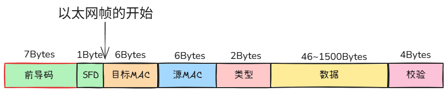 - 前导码:由7个字节组成,用于同步发送方和接收方的时钟,通常是01交替的二进制序列。